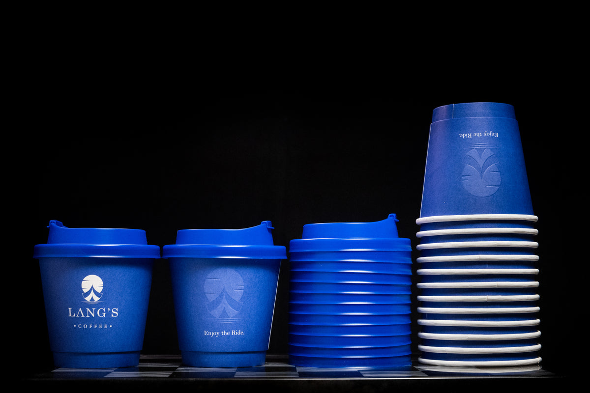 Our signature 8 oz. Blue Lang's Disposable Coffee Cup.
